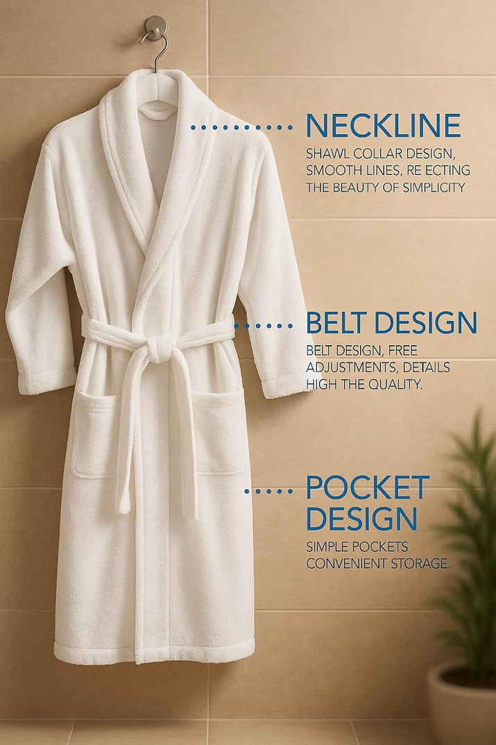 Answer 3: The bathrobe features an adjustable belt and a classic shawl collar, allowing you to customize the fit to your comfort level. Additionally, the generous length provides ample coverage for a secure and stylish look.